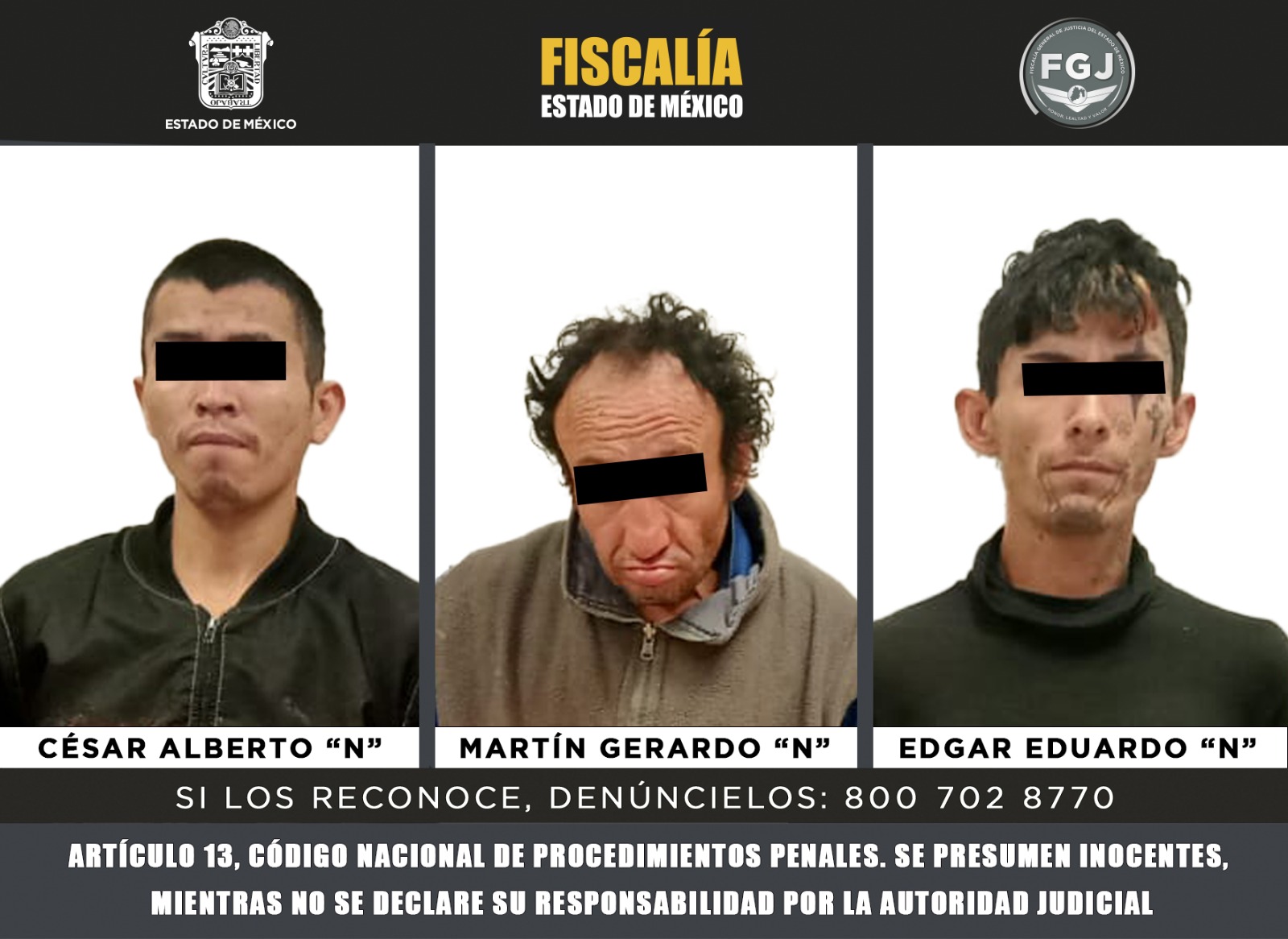 Los tres detenidos fueron identificados como César Alberto “N”, Martín Gerardo “N” y Edgar Ricardo “N”, quienes quedaron a disposición del Ministerio Público por su probable participación en la privación ilegal de la libertad y, en uno de los casos, por presunta posesión de estupefacientes. Las autoridades continúan con las diligencias para esclarecer completamente los hechos.