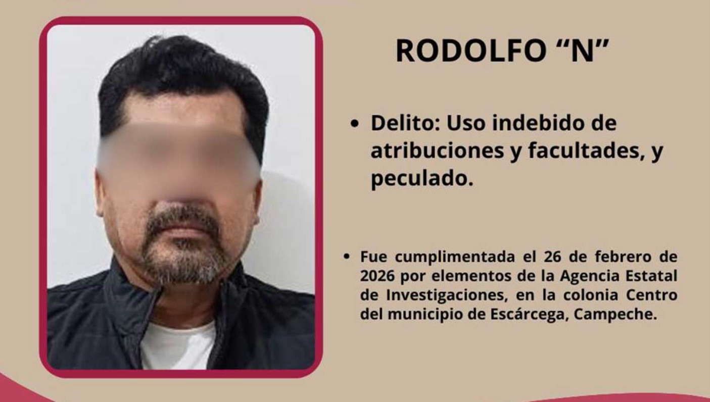 Campeche (Marcrix Noticias).– La Fiscalía General del Estado de Campeche informó la detención de Rodolfo “N”, exalcalde del municipio de Escárcega, acusado de los delitos de uso indebido de atribuciones y facultades, así como de peculado.