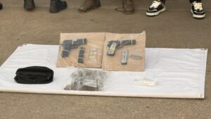 Durante la detención, las autoridades aseguraron dos armas de fuego cortas, una pistola Taurus calibre 9 mm y una Colt’s Government calibre .45 mm, así como cargadores, cartuchos útiles, chalecos tácticos, una mochila tipo cangurera, dinero en efectivo y droga.