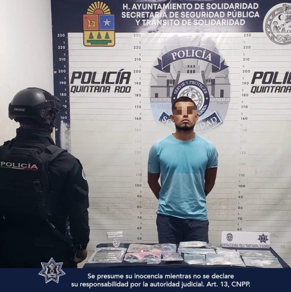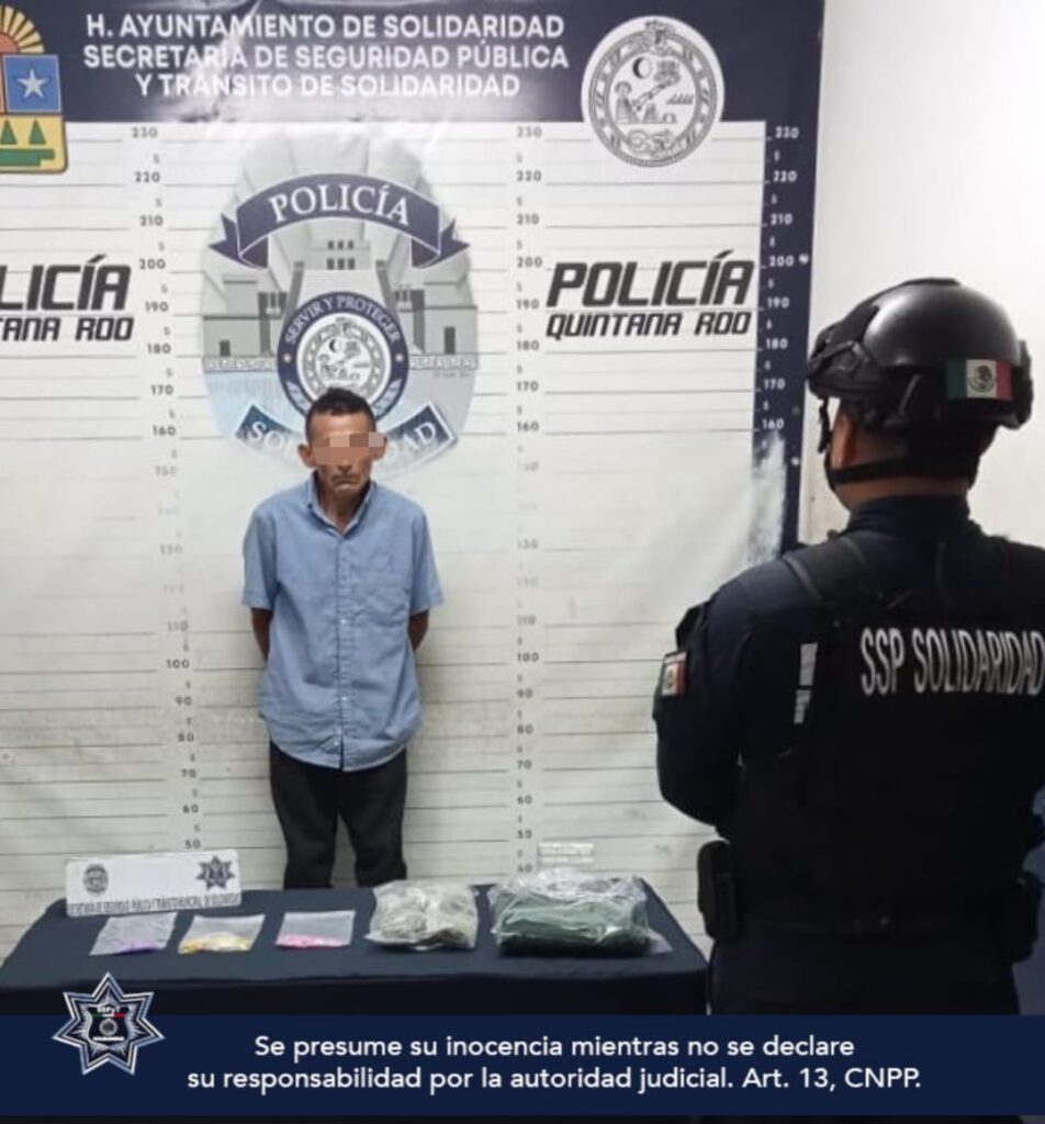 Durante un operativo de vigilancia y disuasión de delitos en el fraccionamiento Las Flores, la Policía Municipal de Solidaridad aseguró a un sujeto y más de 60 dosis de posibles drogas como metanfetamina, cocaína, marihuana y LSD.