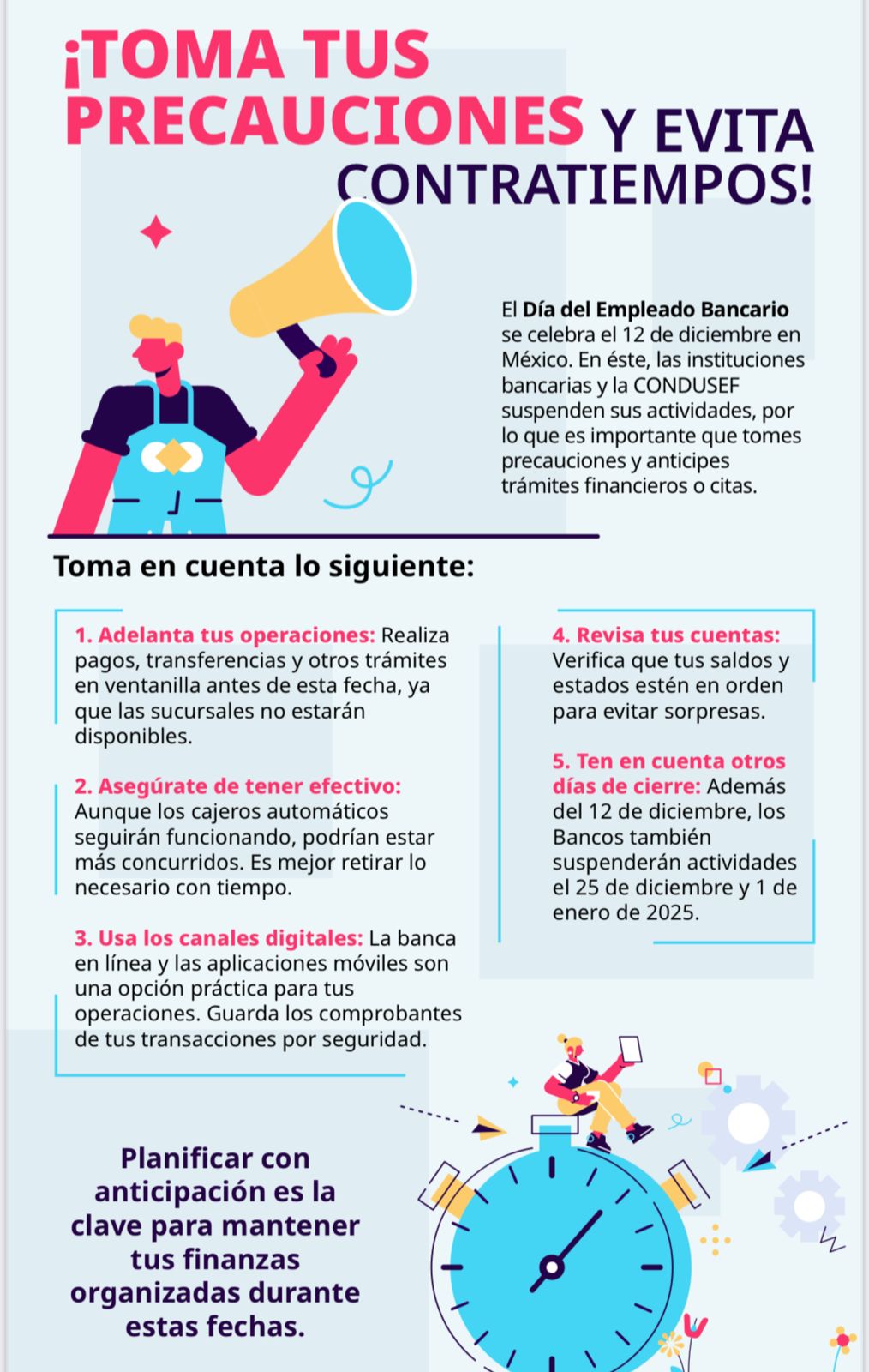 Además del 12 de diciembre, toma en cuenta que los bancos también suspenderán actividades el 25 de diciembre y el 1 de enero de 2025.