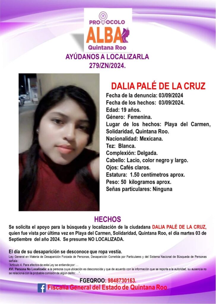 Dalia Palé de la Cruz, de 19 años de edad, desaparecida el 3 de septiembre en Playa del Carmen