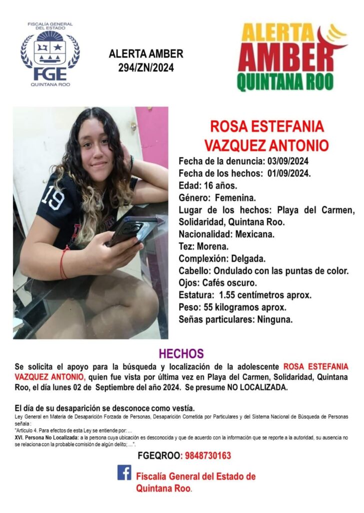 Rosa Estefanía Vázquez Antonio, de 16 años de edad, desparecida el 2 de septiembre en Playa del Carmen.