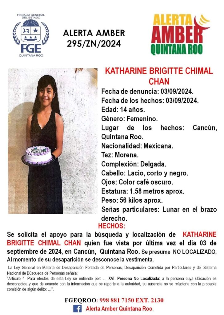 Katharine Brigitte Vhimal Chan, de 14 años de edad, desaparecida el 3 de septiembre en Cancún.