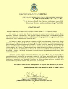 Chetumal (Marcrix Noticias)-La Diócesis de Cancún-Chetumal informó este 13 de enero de 2026 el fallecimiento del presbítero José Antonio Barco Villanueva, integrante de la congregación de los Legionarios de Cristo, quien fue llamado a la presencia de Dios. La noticia fue confirmada a través de un comunicado firmado por el administrador apostólico, monseñor Pedro Pablo Elizondo Cárdenas.