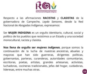 “Pedimos a la gobernadora Layda Sansores que se disculpe 30 días seguidos y consecutivos con las mujeres de los pueblos y comunidades indígenas”, declaró.