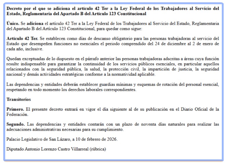 La propuesta fue impulsada por Antonio Lorenzo Castro Villarreal, legislador federal por Coahuila, quien planteó adicionar el artículo 42 Ter a la Ley Federal de los Trabajadores al Servicio del Estado para establecer como días de descanso obligatorio el periodo comprendido del 24 de diciembre al 2 de enero de cada año.