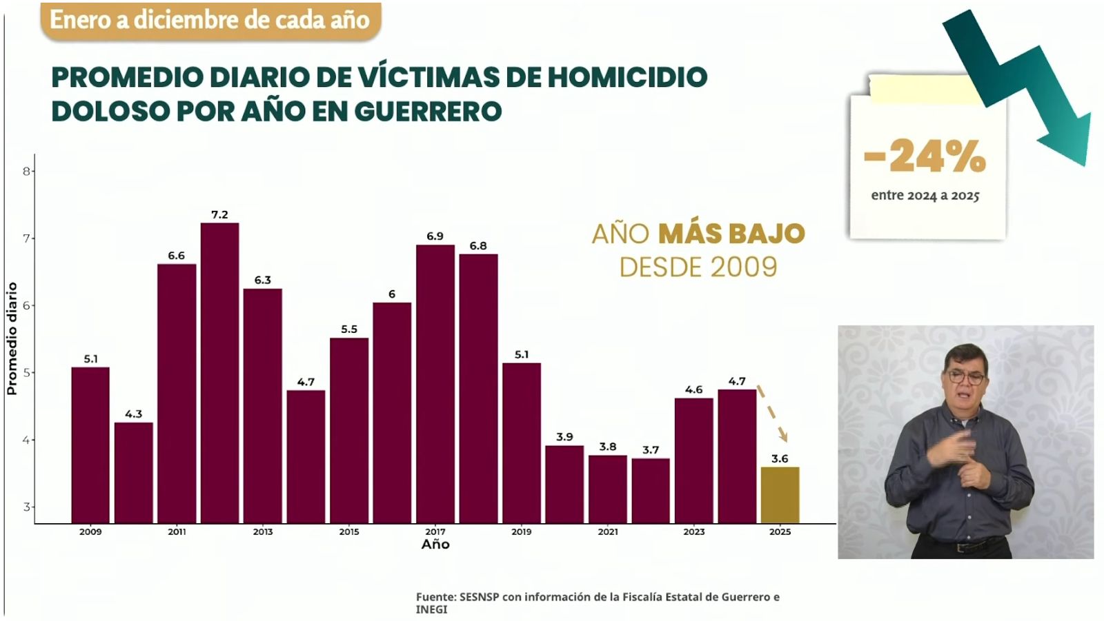 El gobierno federal informó que los homicidios dolosos en Guerrero registraron una disminución del 65 por ciento, resultado de la estrategia de seguridad aplicada desde el inicio de la actual administración encabezada por Claudia Sheinbaum