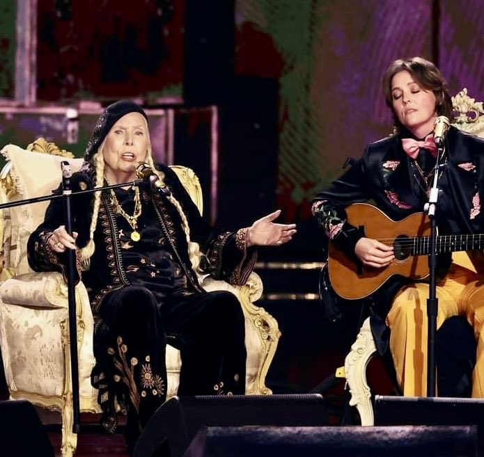 La cantautora canadiense Joni Mitchell, gran influyente del folk en los años 60, actuó por primera vez en una ceremonia de los premios Grammy, donde ha sido nominada en 18 nominaciones y ha recibido nueve premiaciones.