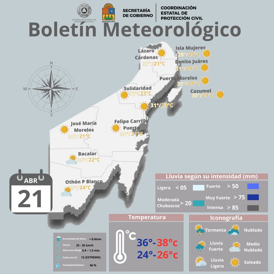 1.- Afluencia de aire húmedo proveniente del Mar Caribe hacia la región peninsular y el Estado de Quintana Roo, originará cielo parcialmente nublado, sin lluvias sobre el Estado, ambiente muy caluroso a bochornoso durante el día y cálido durante la madrugada y el amanecer, así como temperaturas diurnas de 35 a 40 GC.