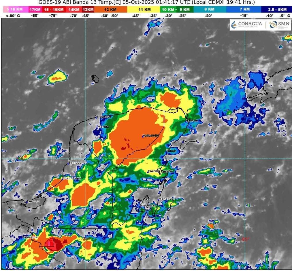 El organismo detalló que la Península de Yucatán presentará cielo nublado durante el día, con lluvias intensas en el este y sureste de Quintana Roo, así como en el centro y suroeste de Campeche. En Yucatán se prevén precipitaciones muy fuertes.