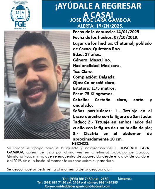 También fue emitida la ficha de búsqueda y localización de José Noé Lara Gamboa, visto por última vez el 7 de octubre de 2019, en el poblado de Cacao, Chetumal, Quintana Roo.