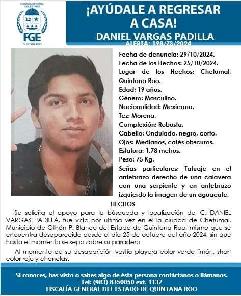 Asimismo la FGE emitió otra ficha de búsqueda y localización por la desaparición de Daniel Vargas Padilla, de 19 años, quien desapareció el 25 de octubre en Chetumal.