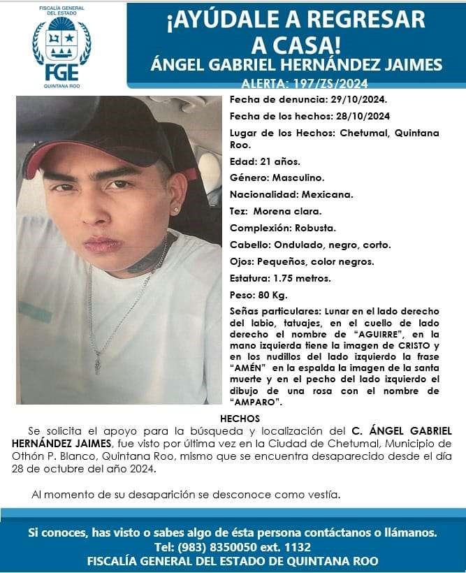 Asimismo la FGE emitió otra ficha de búsqueda y localización por la desaparición de Daniel Vargas Padilla, de 19 años, quien desapareció el 25 de octubre en Chetumal.
