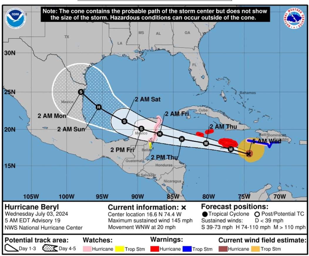 El centro del huracán Beryl de categoría 4 en la escala Saffir-Simpson se localiza a 300 km al Este-sureste de Kingston, Jamaica, y a 1,400 km al Este-Sureste de Cancún, Quintana Roo.
