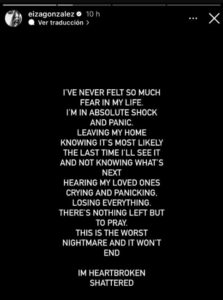 A través de sus redes sociales, Eiza compartió el angustioso momento en que tuvo que dejar su residencia, expresando su miedo y tristeza por la incertidumbre del futuro.