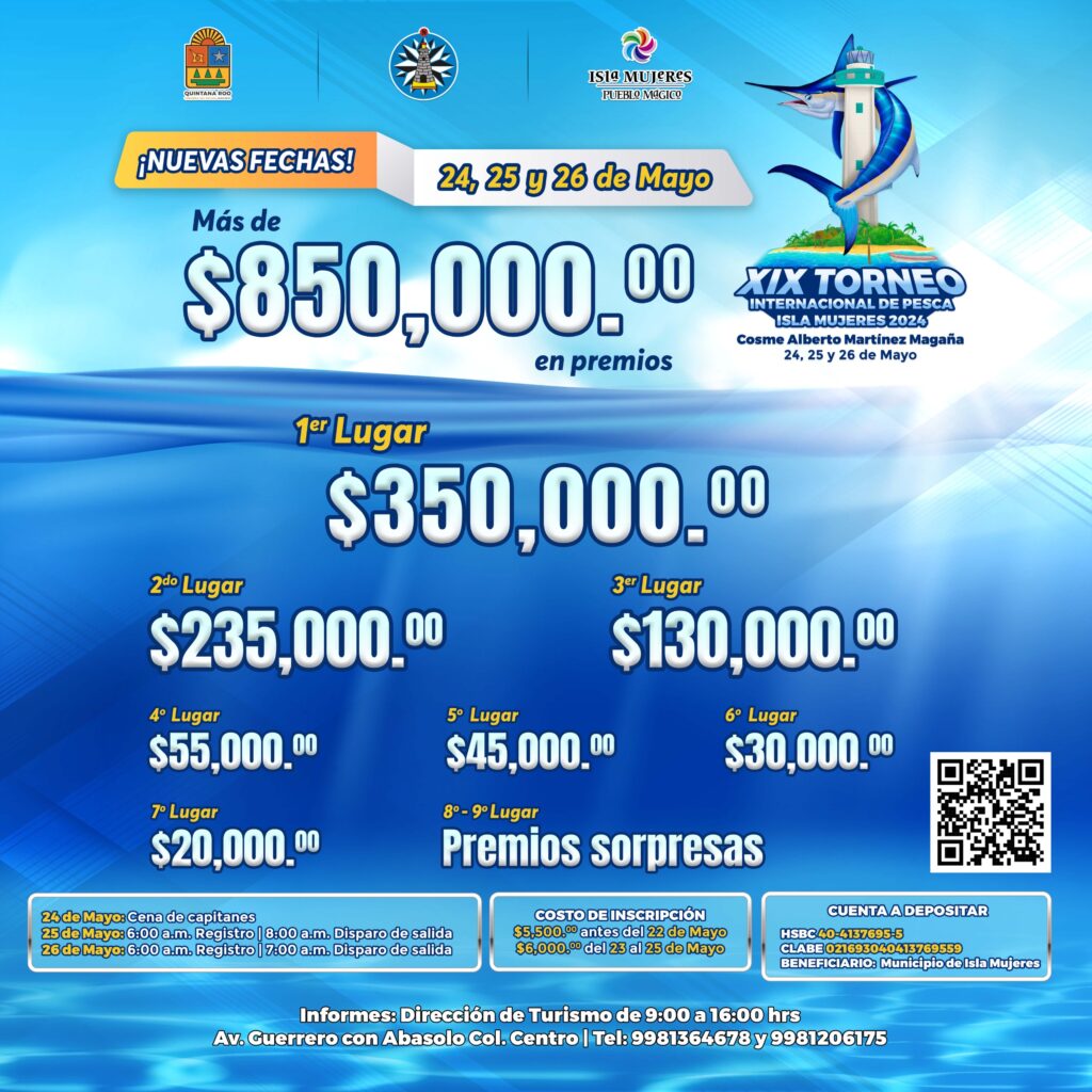 Con dicho cambio el torneo arrancará el próximo 24 de mayo con la Cena de Capitanes a las 7 de la noche en el restaurante Coco’s, el 25 de mayo a las 8 de la mañana será el disparo de salida y primer día de pesca y el 26 de mayo será el segundo día de pesca y la premiación a las 5 de la tarde en Playa Centro.