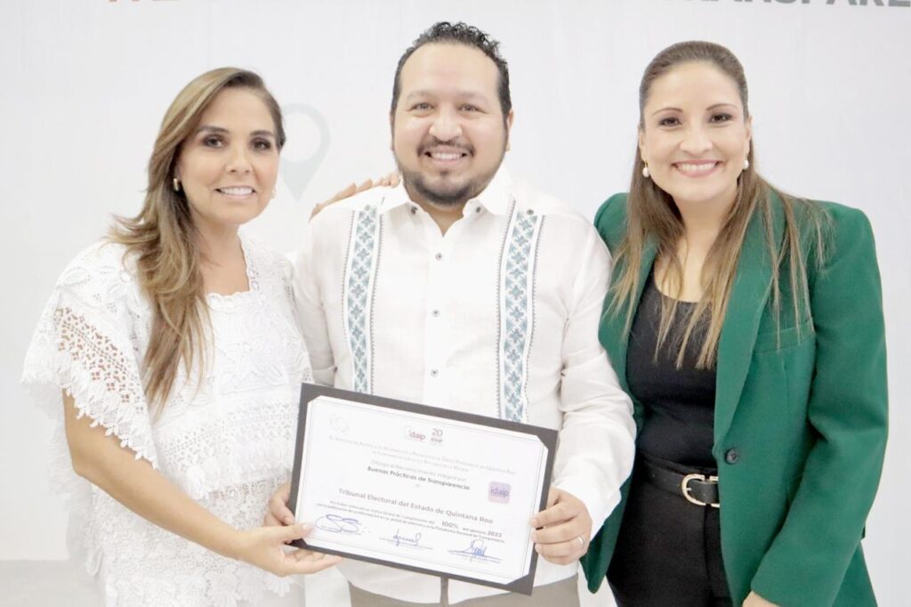 Chetumal, Quintana Roo, (MARCRIX Noticias), a 13 de agosto de 2024.- El Magistrado Presidente del Tribunal Electoral de Quintana Roo (TEQROO), Sergio Avilés Demeneghi recibió de manos de la Gobernadora del Estado de Quintana Roo, María Elena Lezama Espinosa, el reconocimiento por “Buenas Prácticas de Transparencia”, que califica el ejercicio 2023, por haber alcanzado una calificación del 100% en el Índice Global de Cumplimiento de Obligaciones de Transparencia.