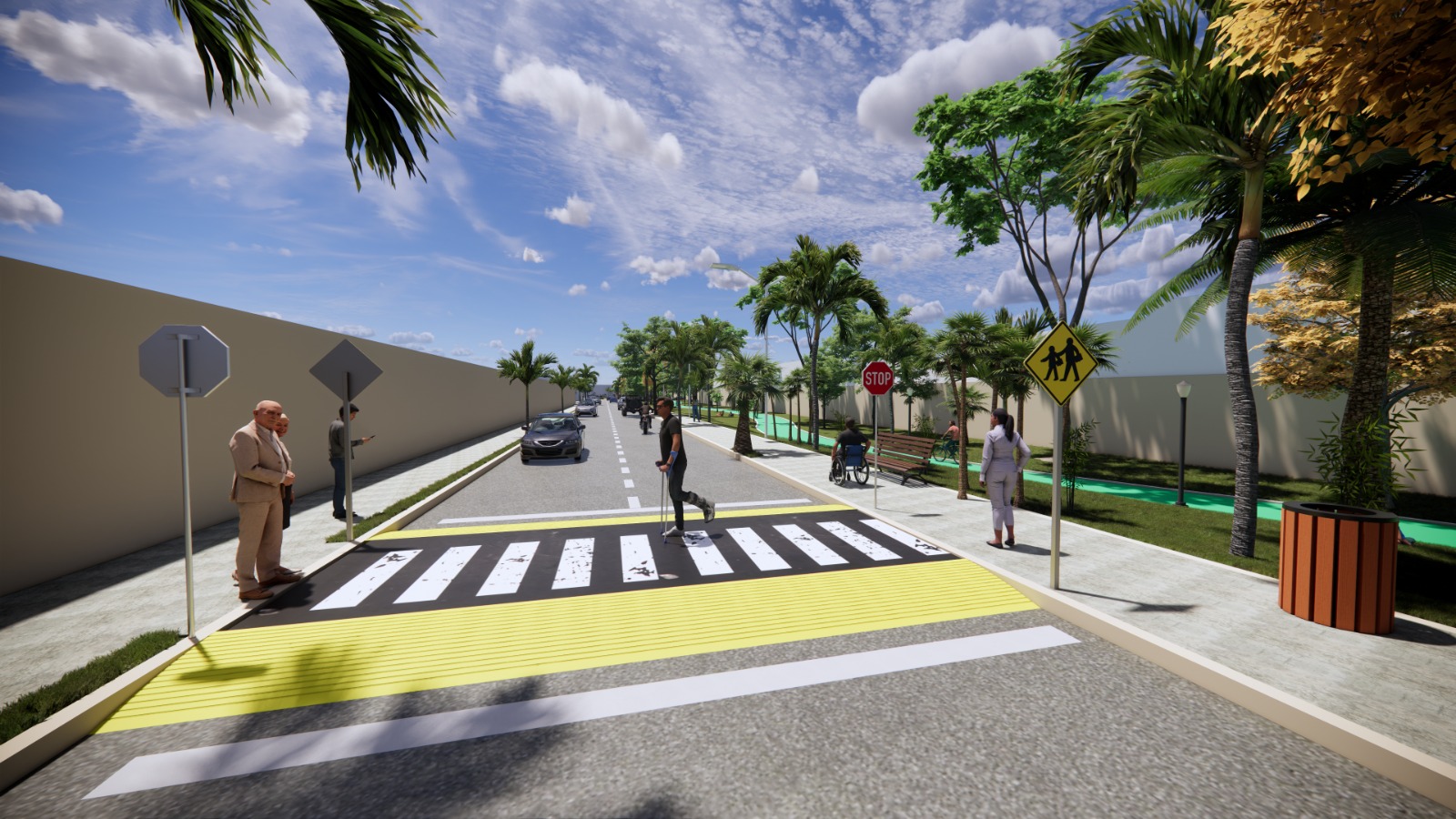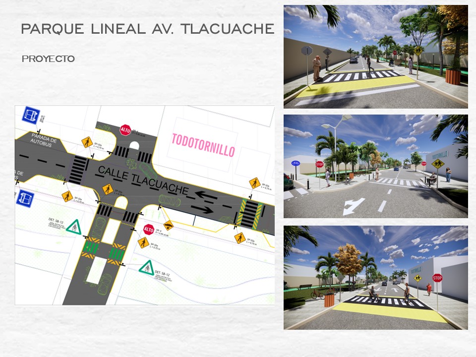 También señaló que, con el objetivo de construir entornos accesibles, seguros y autónomos en cruces peatonales para ciudadanos y personas con discapacidad, se elaboraron tres anteproyectos de infraestructura urbana incluyente, con señalización horizontal y vertical, rampas con pendiente adecuada, guías podotáctiles, luminarias peatonales y superficies antideslizantes.