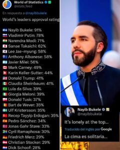 El Salvador (Marcrix Noticias).- El Salvador es uno de los países más seguros del Mundo y su presidente Nayib Bukele se ha convertido en el líder con mayor aprobación a nivel mundial alcanzando un 91%, 50 por ciento más que Donald Trump, presidente de Estados Unidos.