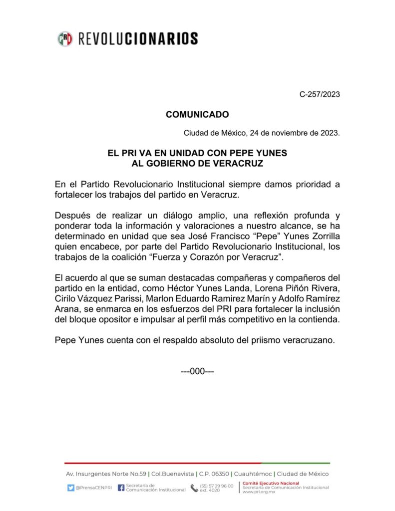“Se ha determinado en unidad que sea Pepe Yunes quien encabece, por parte del Partido Revolucionario Institucional, los trabajos de la coalición Fuerza y Corazón por Veracruz”, dijo el dirigente nacional del tricolor, Alejandro Moreno a través de sus redes sociales.