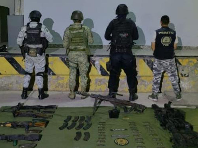 Entre las armas aseguradas se encuentra un fusil Barret, antiblindaje; tres “cuernos de chivo” AK-47; 15 cargadores para arma larga; 265 cartuchos útiles; tres chalecos tácticos, así como una camioneta con reporte de robo.
