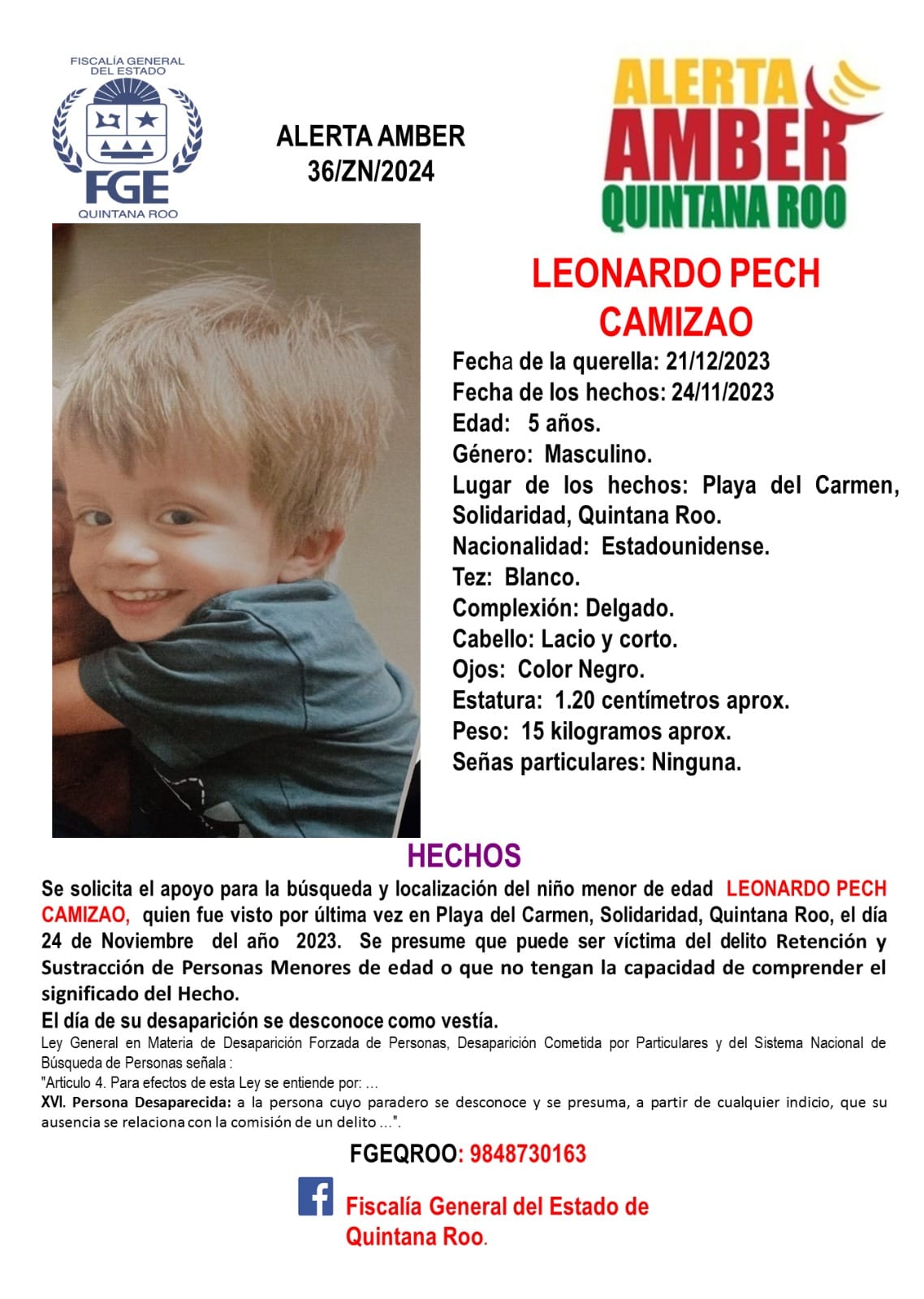 Playa del Carmen (Marcrix Noticias).- La Fiscalía General del Estado de Quintana Roo emitió la ficha de búsqueda de Leonardo Pech Camizao, visto por última vez el 24 de noviembre de 2023, en el la ciudad de Playa del Carmen, municipio de Solidaridad.