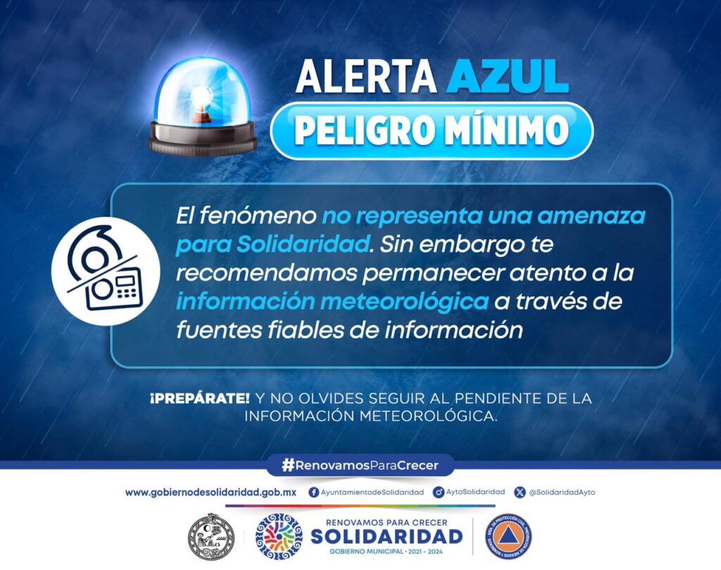Playa del Carmen, Solidaridad, (MARCRIX Noticias), a 30 de junio del 2024. – Ante el acercamiento del huracán Beryl categoría 4, el gobierno de Solidaridad que dirige la presidenta Lili Campos emite la alerta azul de peligro mínimo para las costas de Solidaridad, sin que sea algún riesgo para el municipio, por lo que se exhorta a la población a mantenerse informado en medios oficiales.