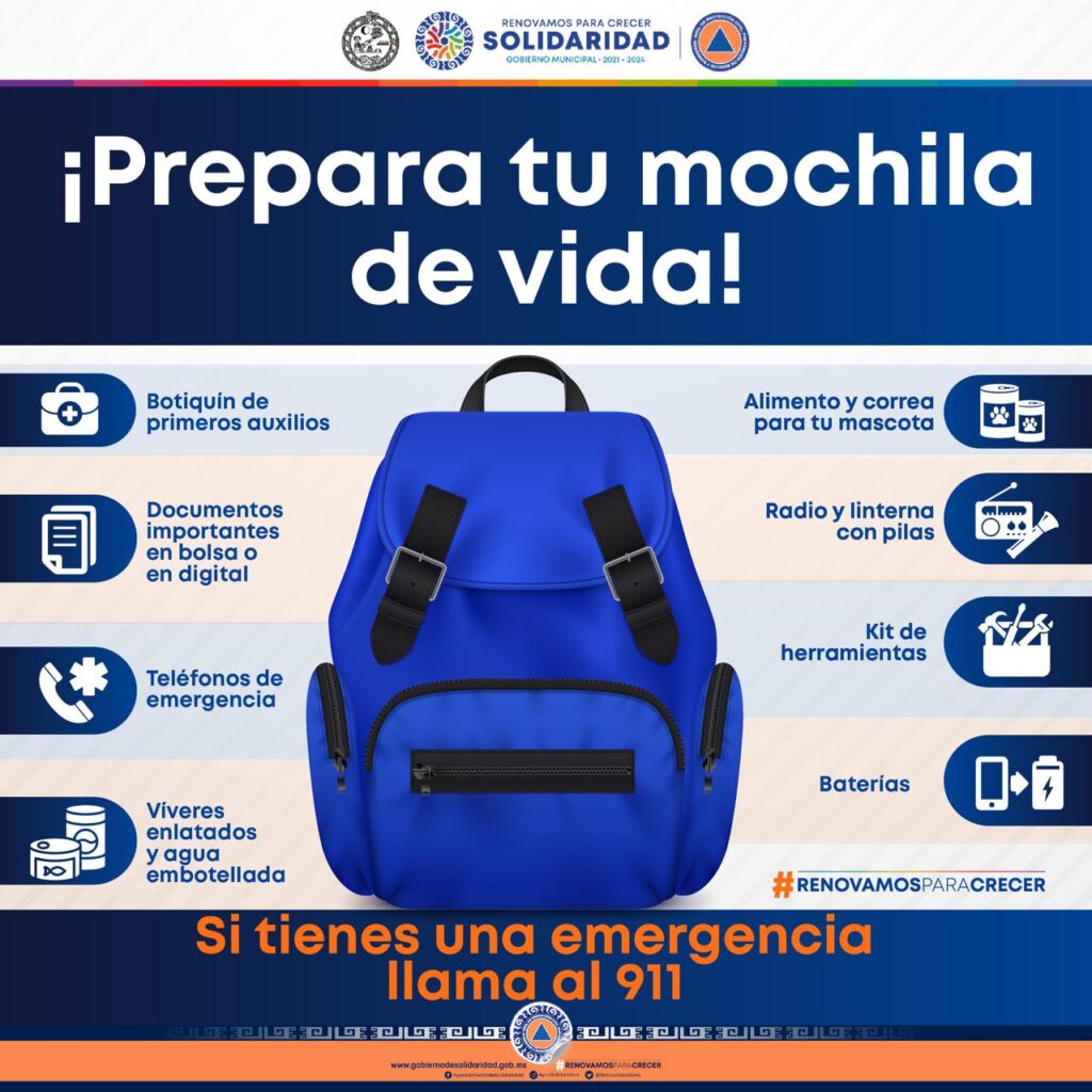 Detalló que es importante se tenga a la mano una mochila de vida la cual debe contener: un botiquín de primeros auxilios, documentos importantes en bolsa o en digital, víveres enlatados y agua embotellada, en caso de tener mascotas llevar alimento y correa, radio y linternas con pilas, algún kit de herramientas y baterías.