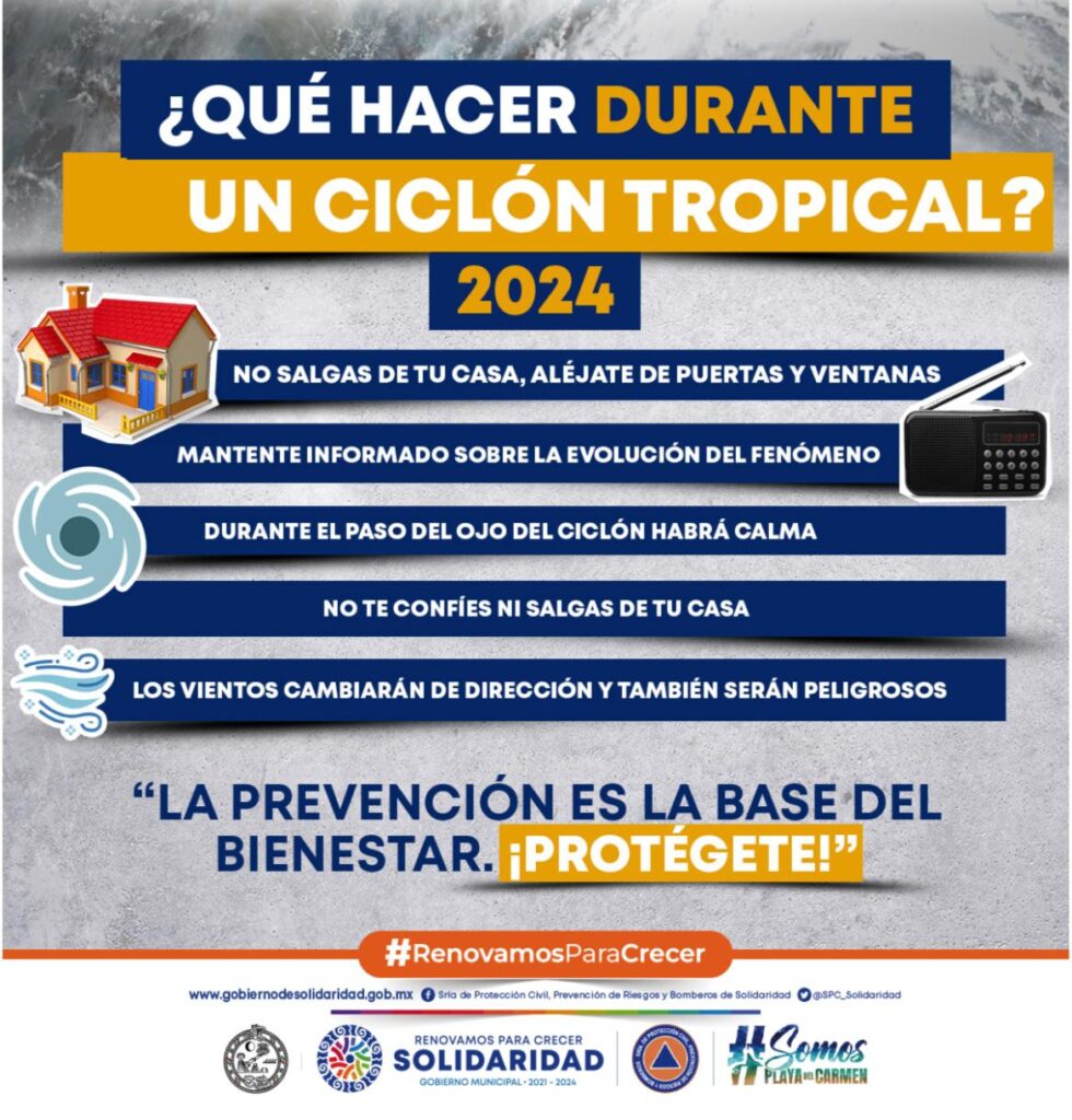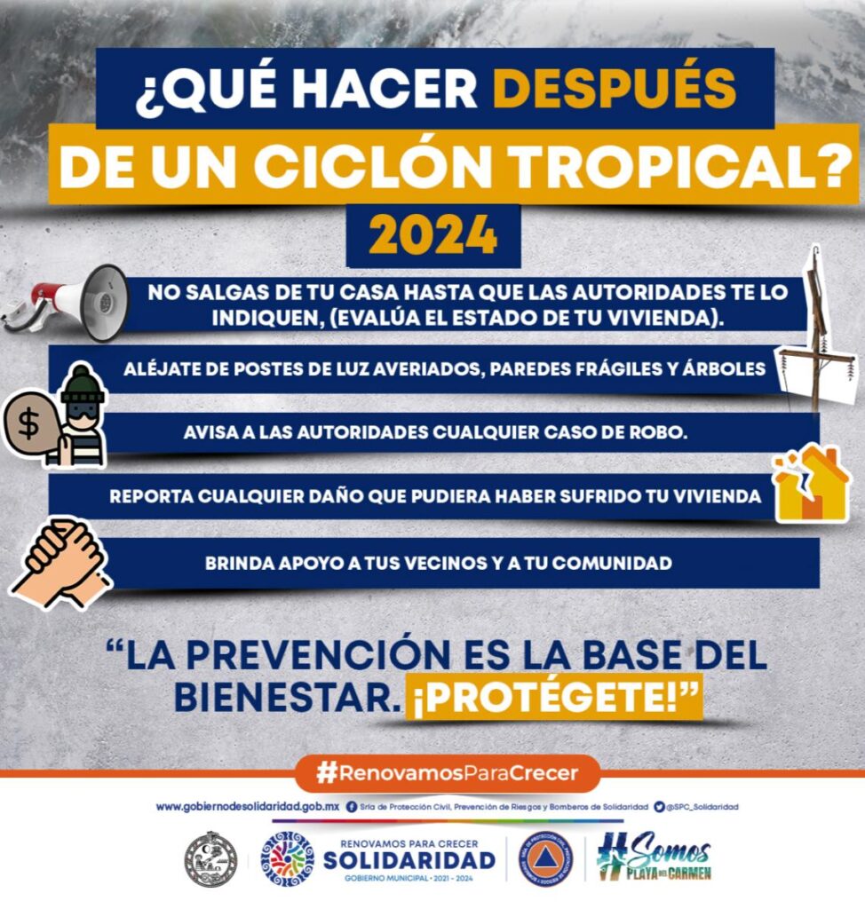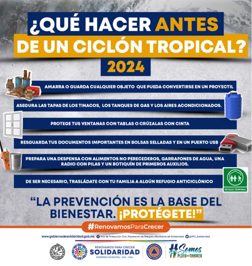 Jorge Oropeza, secretario de Protección Civil, Prevención de Riesgos y Bomberos de Solidaridad dio algunas recomendaciones para las y los solidarenses ante la llegada de algún fenómeno hidrometeorológico como lo son: asegurar las tapas de los tinacos, tanques de gas y aires acondicionados, proteger ventanas con tablas o cruzarlas con cinta, exhortó además, a no caer en pánico y seguir las recomendaciones de las autoridades.
