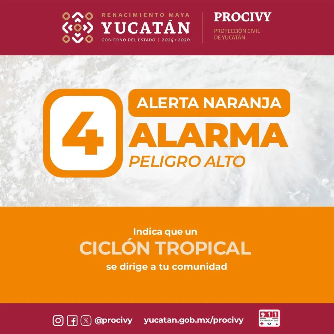 Según el Gobierno de Yucatán, la Alerta Naranja se establece cuando un ciclón tropical se aproxima lo suficiente como para prever la llegada de vientos de 34 nudos (aproximadamente 63 km/h) en un plazo de entre 36 y 6 horas, dependiendo de la intensidad del fenómeno. Esta alerta también señala un peligro alto, por lo que se emitirán boletines informativos al menos cada tres horas para actualizar la situación.