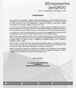 Cancún(Marcrix Noticias).- Tras el asesinato del líder sindical Mario Machuca, Empresarios por Quintana Roo emitió un comunicado en el que expresó su profunda consternación por los hechos y exigió a las autoridades garantizar justicia, advirtiendo que este tipo de crímenes representan una amenaza directa al desarrollo y la paz social en el estado.