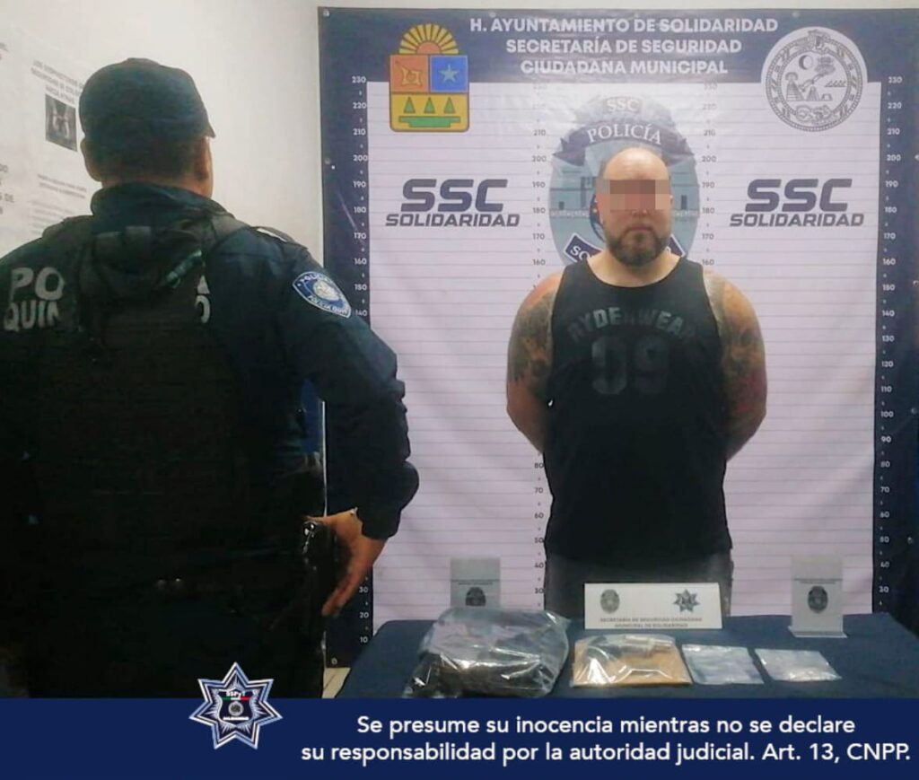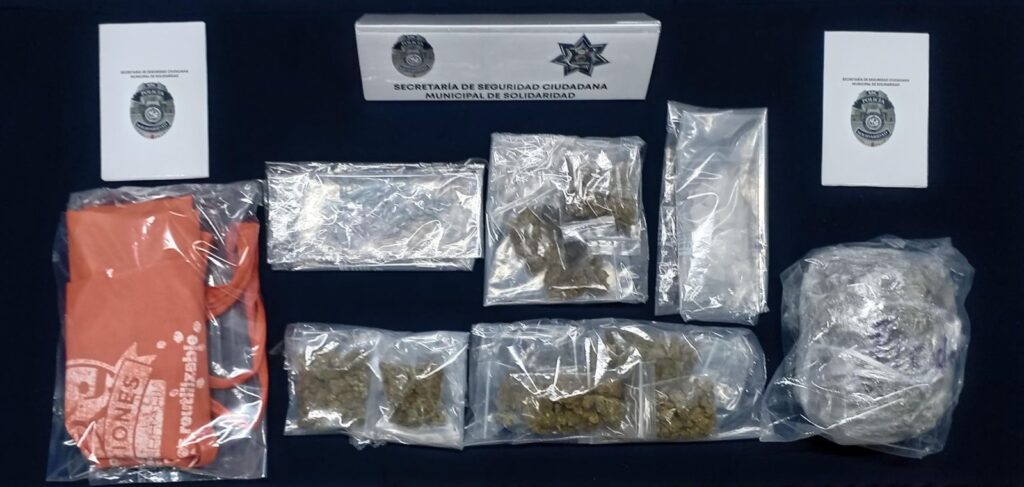 En el primer hecho, durante un recorrido de vigilancia en la colonia Ejido, la Policía Municipal de Solidaridad aseguró a dos hombres y una mujer así como más de 30 envoltorios y un paquete con posibles drogas como cristal, piedra y marihuana.