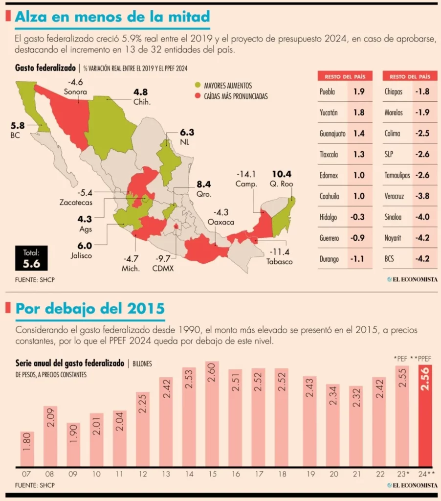 De acuerdo con la Secretaría de Hacienda y Crédito Público, con el gobierno de López Obrador el gasto federalizado, que son los recursos que el gobierno federal transfiere a entidades y municipios a través de participaciones y aportaciones, así como subsidios y convenios, aumentó 5.6% en términos reales entre el dato observado del 2019 y el Proyecto de Presupuesto de Egresos de la Federación (PPEF) 2024.