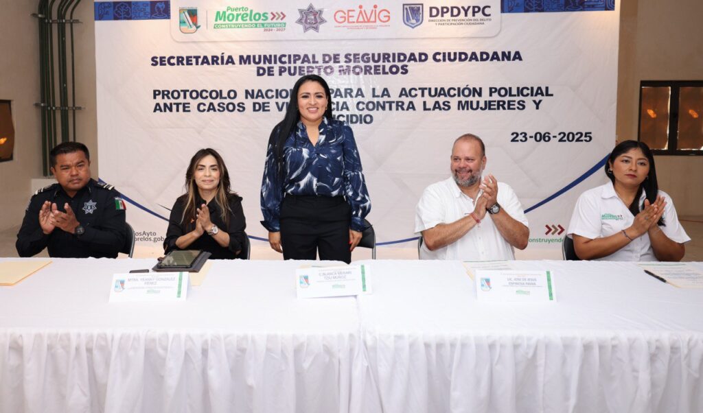 Puerto Morelos (Marcrix Noticias).— Al poner en marcha el Curso-Taller relativo al Protocolo Nacional para la Actuación Policial ante Casos de Violencia contra las Mujeres y Feminicidio y el Protocolo Nacional de Coordinación Interinstitucional para Protección de Niñas, Niños y Adolescentes Víctimas de Violencia, la presidenta municipal Blanca Merari Tziu Muñoz aseguró que reforzar la capacitación de funcionarias y funcionarios en esos rubros es un compromiso firme de su administración.