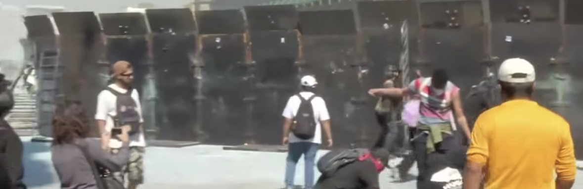 En las imágenes captadas por reporteros se aprecia cómo los encapuchados derriban parte de la estructura metálica colocada como protección, mientras los presentes se repliegan por seguridad. A pesar de la agresividad del grupo, los policías lograron contenerlos y mantener la línea de seguridad para impedir el ingreso al área restringida.