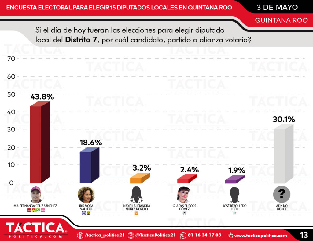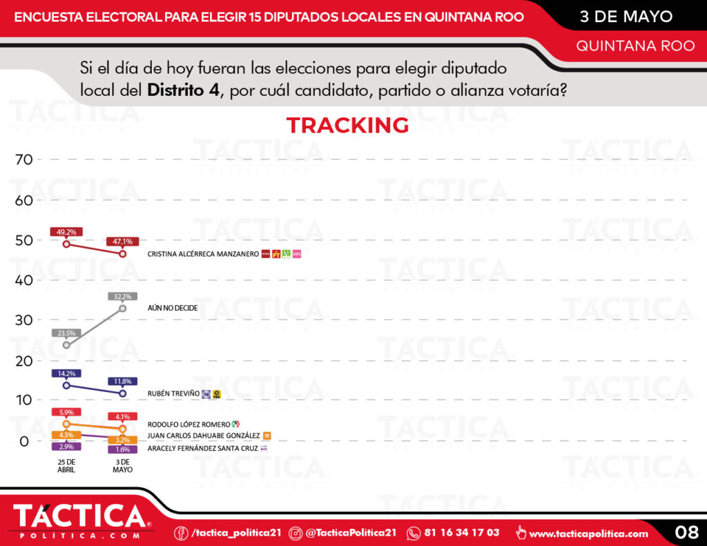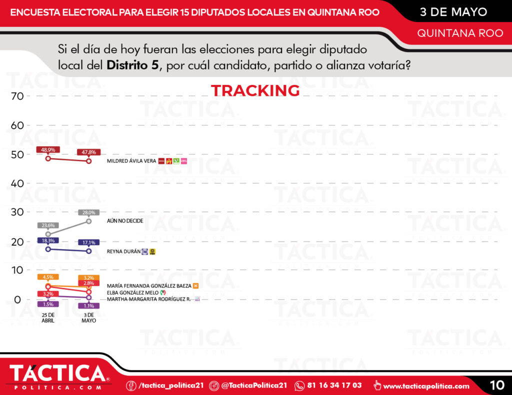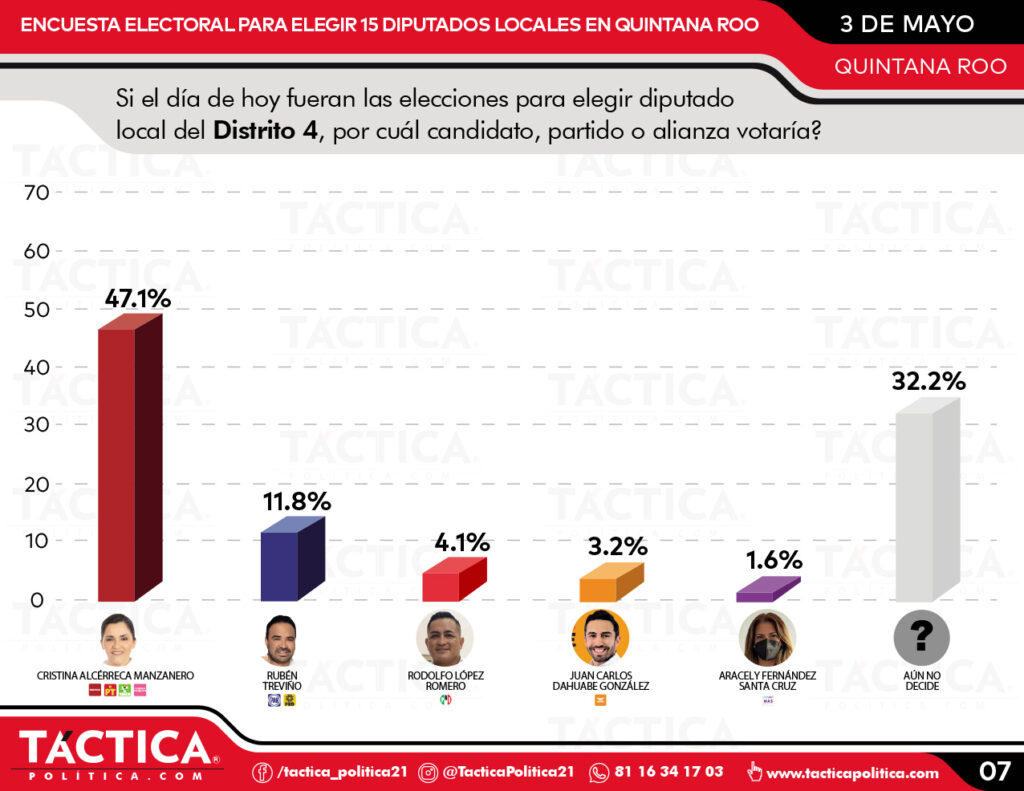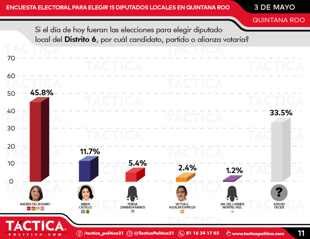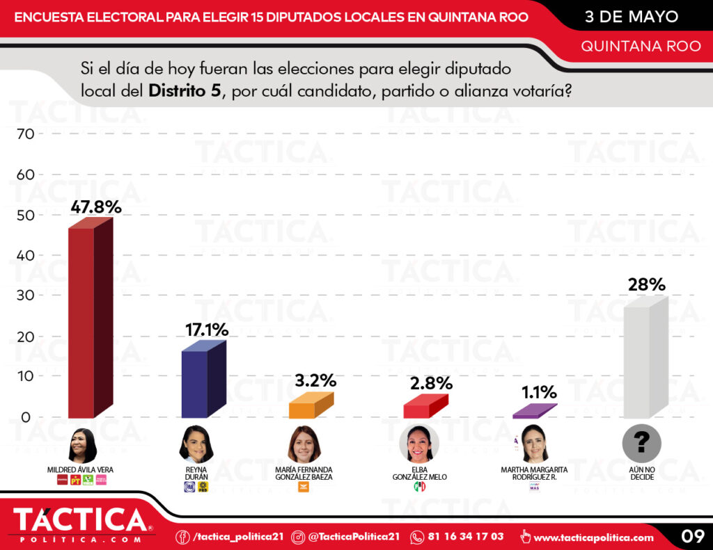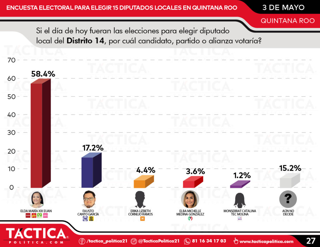 En el Distrito 9, Silvia Dzul Sánchez también tiene prácticamente ganada la elección con el apoyo del 56.3% de los encuestados, mientras la sigue muy lejos Rolando Alcocer Castillo con 14.2%.