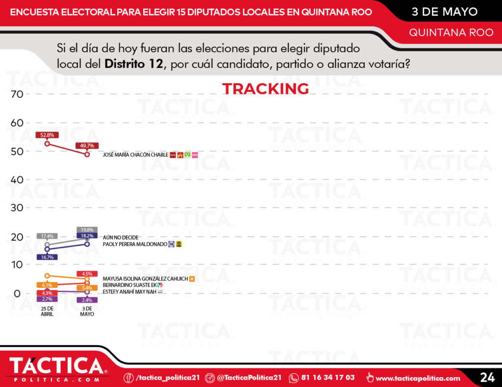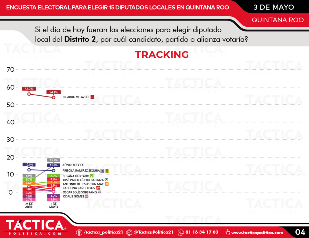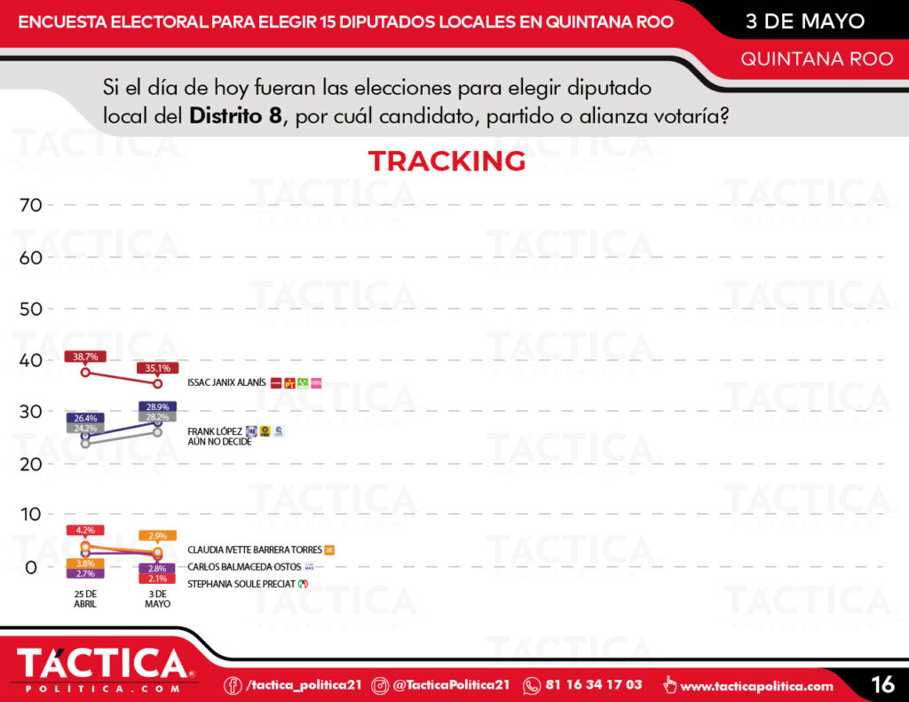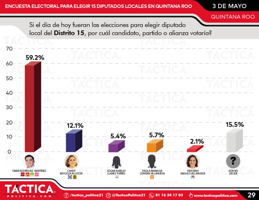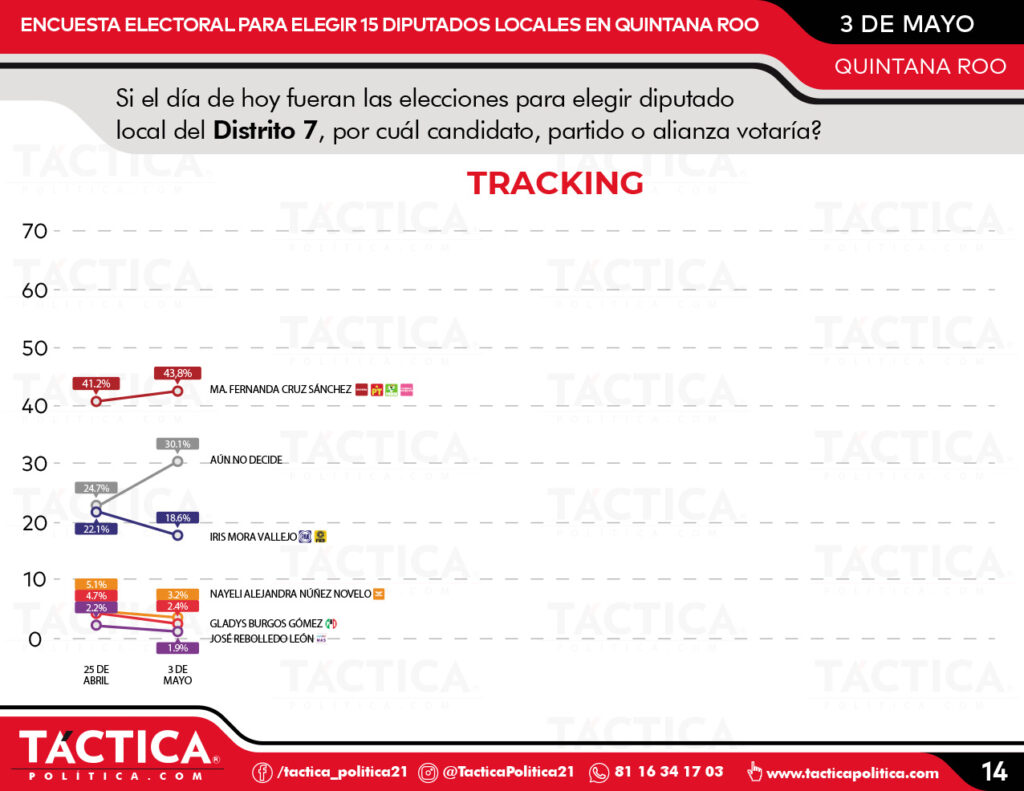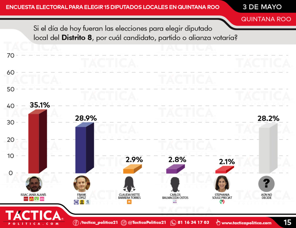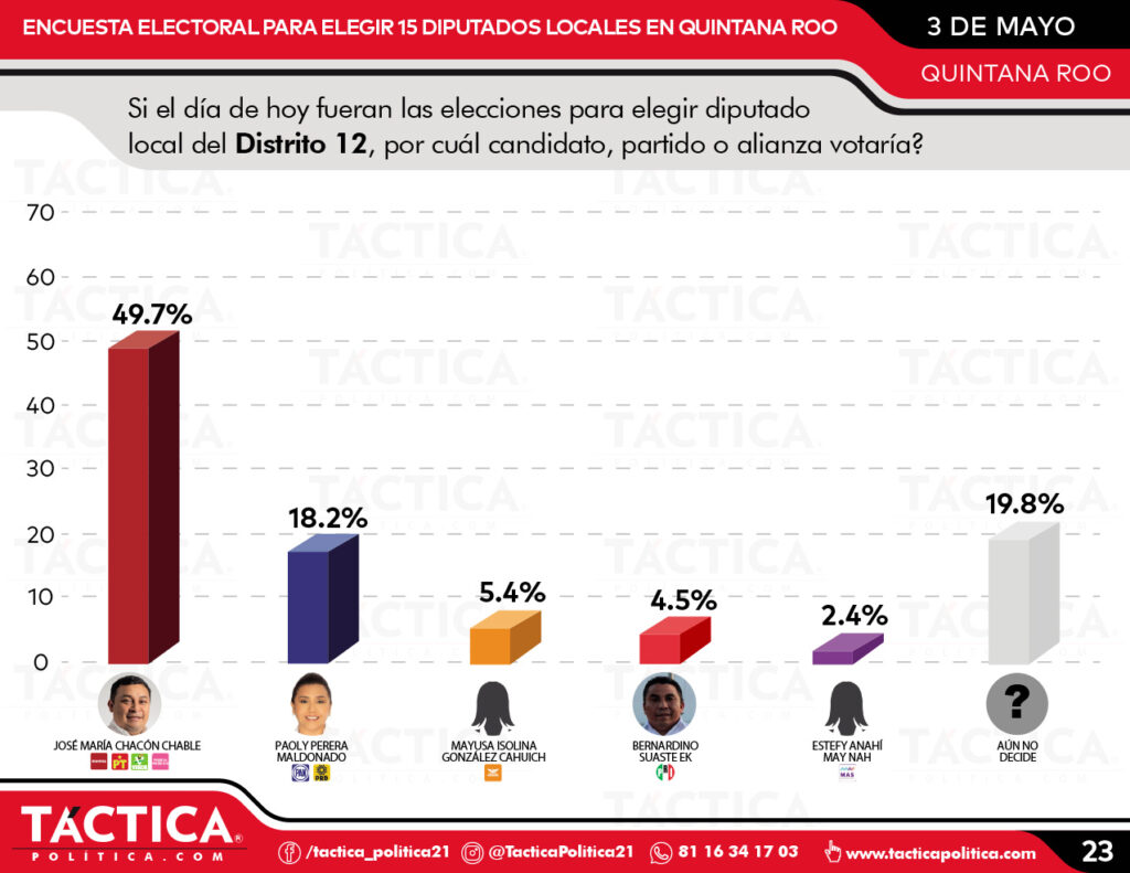 En el Distrito 9, Silvia Dzul Sánchez también tiene prácticamente ganada la elección con el apoyo del 56.3% de los encuestados, mientras la sigue muy lejos Rolando Alcocer Castillo con 14.2%.