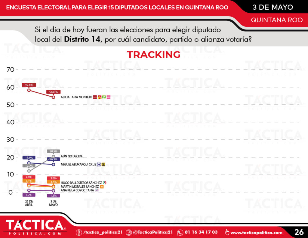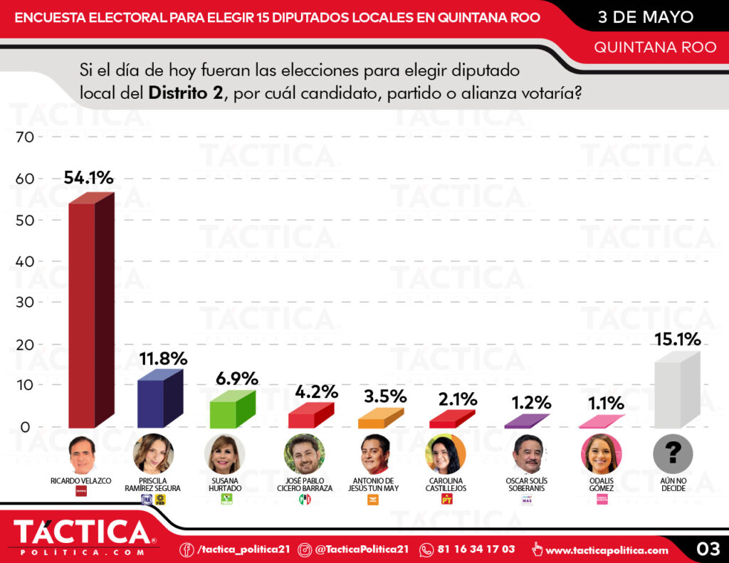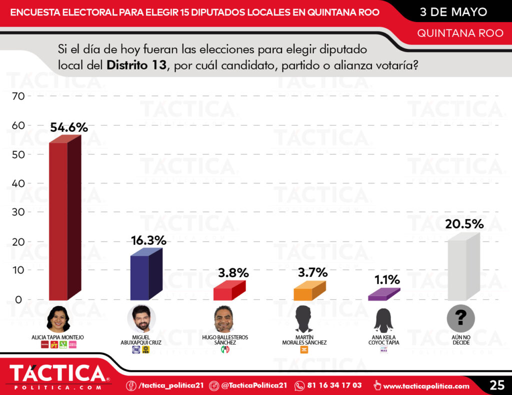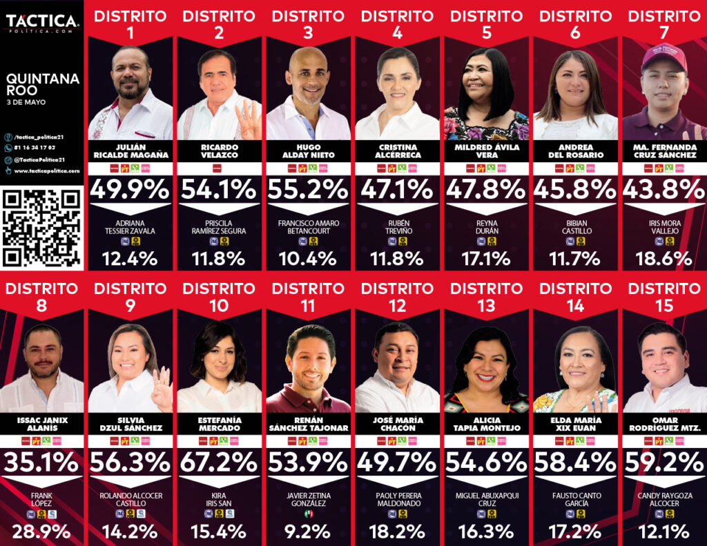 Cancún (Marcrix Noticias).- De acuerdo con la última encuesta hecha por “Táctica Política”, la coalición “Juntos Hacemos Historia” integrada por Morena, Partido Verde Ecologista, del Trabajo y Fuerza por México estaría arrasando en los 15 distritos electorales para las diputaciones locales de Quintana Roo.