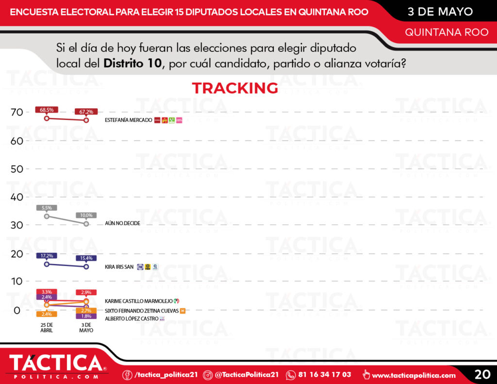 En el Distrito 10, Estefanía Mercado también tiene una abrumadora ventaja, pues del 100% de los entrevistados, el 67.2% respondió a favor de ella, mientras en segundo lugar está Kira Iris con 15.4%.
