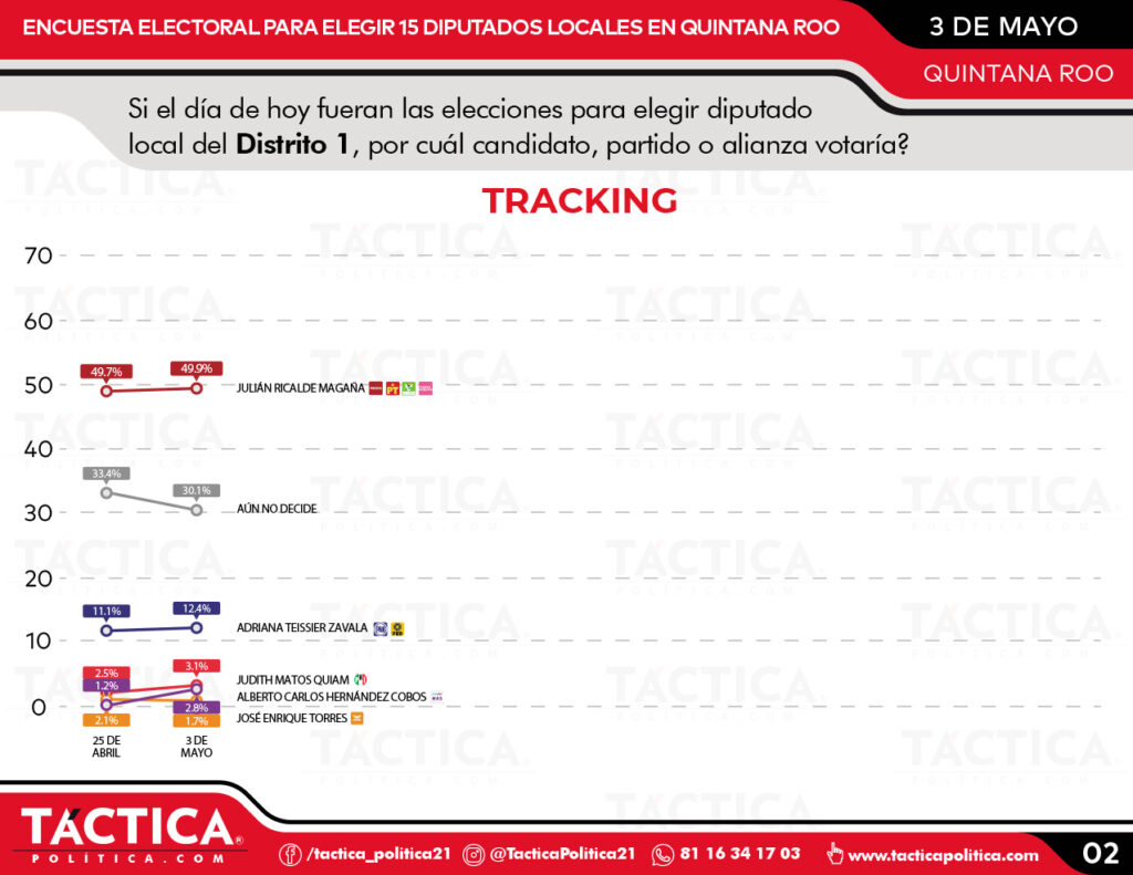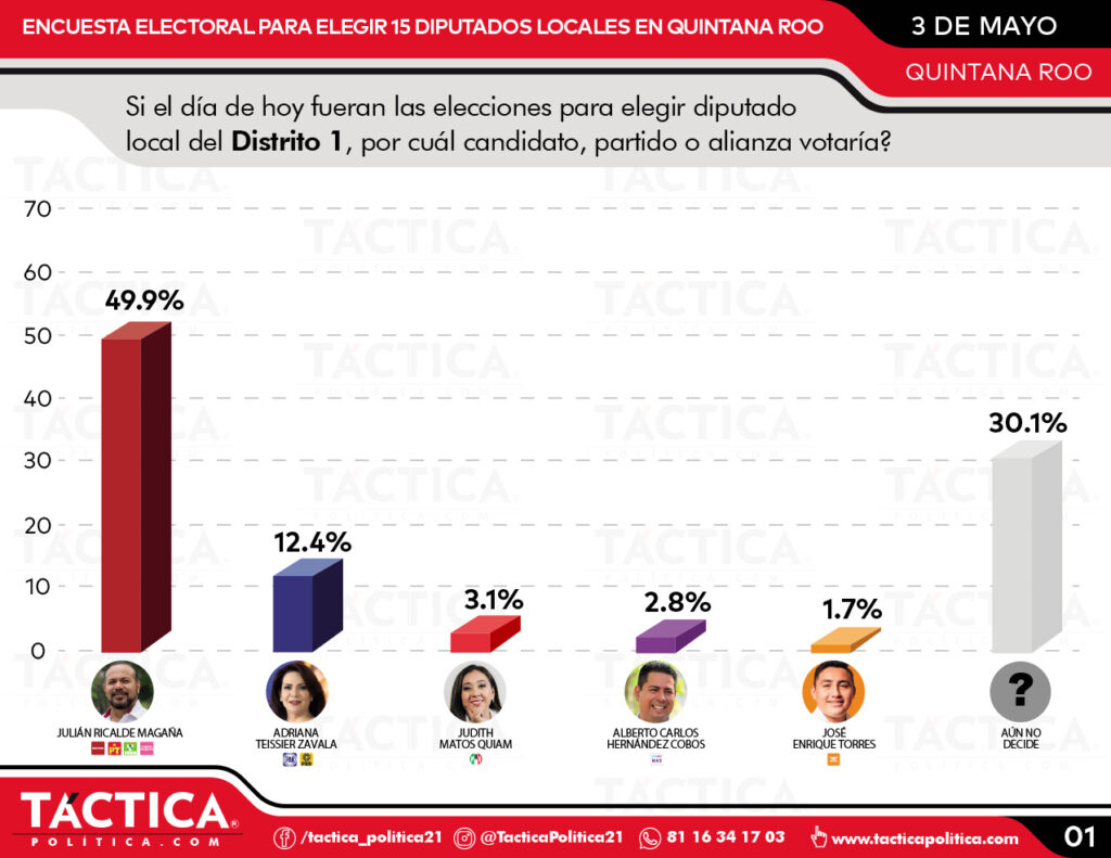 En el Distrito 1 de Quintana Roo, Julián Ricalde Magaña es quien tiene una aplastante ventaja, al tener la preferencia del 49.9%, seguido muy atrás por Adriana Tessier Zavala con 12.4%.