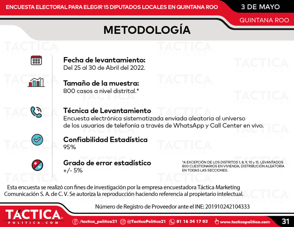 El levantamiento de la encuesta se hizo del 25 al 30 de abril a 800 personas y tiene un margen de error de +/- 5%, cuenta con una confiabilidad del 95%.
