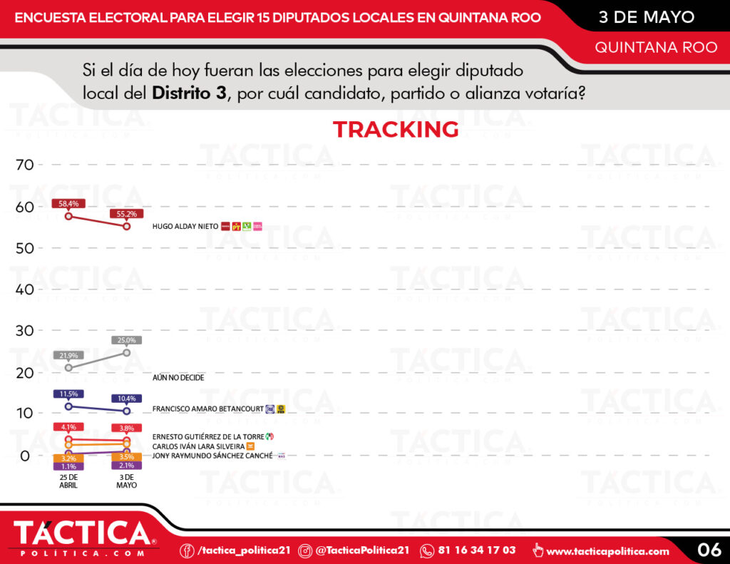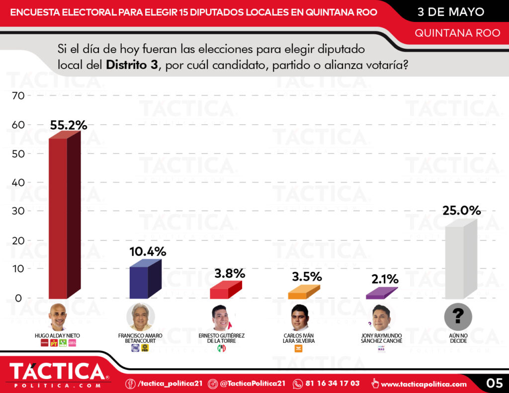 En el Distrito 3, Hugo Alday tiene una muy amplia ventaja de 45 puntos, al tener la preferencia del 55.2 de los entrevistados, mientras su más cercano seguidor, Francisco Amaro Betancourt solo tiene el 10.4% de la aceptación.