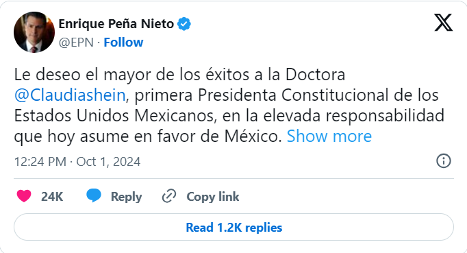 Peña Nieto, quien había estado ausente de la plataforma desde 2022, expresó: “Le deseo el mayor de los éxitos a la Doctora Claudia Sheinbaum, primera Presidenta Constitucional de los Estados Unidos Mexicanos, en la elevada responsabilidad que hoy asume en favor de México.”