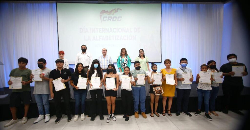 Cancún, Quintana Roo., jueves 08 de septiembre de 2022.- La Confederación Revolucionaria de Obreros y Campesinos (CROC) en Benito Juárez llevó a cabo la entrega de certificados de primaria y secundaria a quienes concluyeron sus estudios de nivel básico en el marco del Día Internacional de la Alfabetización.