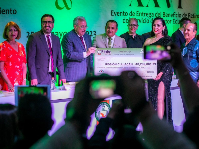 Como producto de décadas al servicio del magisterio, el gobernador Rubén Rocha Moya entregó a 238 maestras y maestros de todo el estado, sus estímulos por jubilación y retiro de la docencia a los que se hicieron merecedores a través del Fideicomiso del FigloSNTE 53, que de manera individual ascendieron a 167 mil pesos en promedio, lo que arrojó un total de 39 millones de pesos.