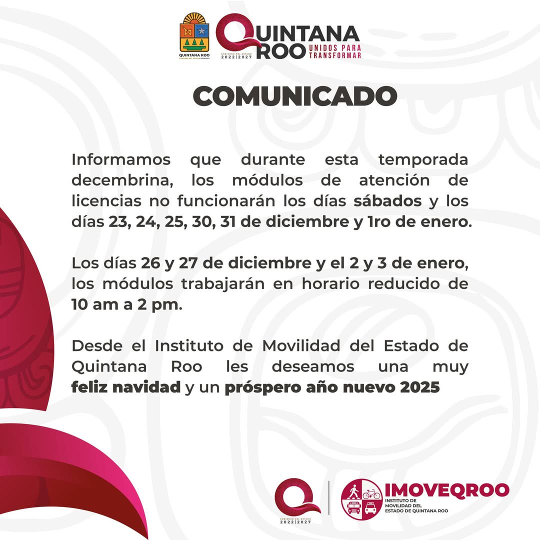 Cancún(Marcrix Noticias).- El Instituto de Movilidad del Estado de Quintana Roo (Imoveqroo) informó a la ciudadanía que, durante la temporada decembrina, los módulos de atención para la expedición de licencias de conducir no operarán en los siguientes días: