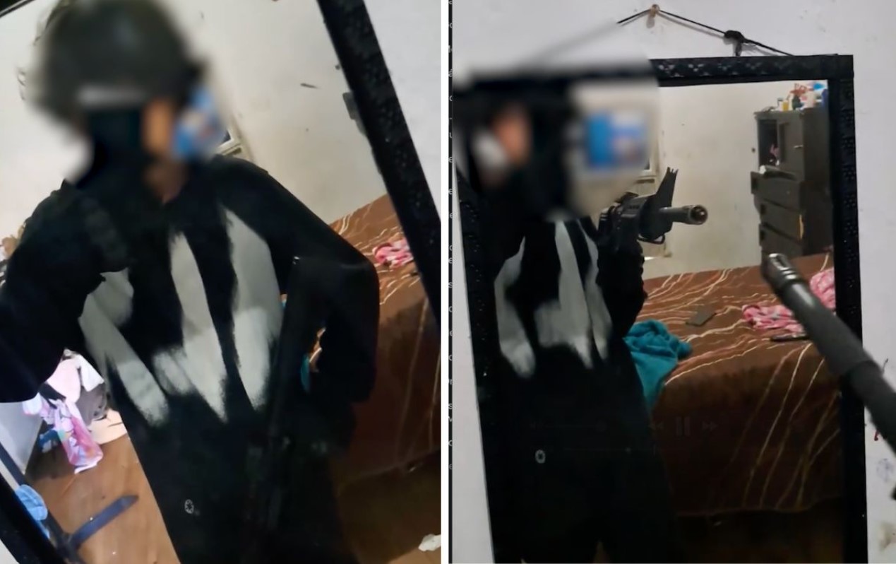 En uno de los clips, el joven se muestra frente a un espejo vistiendo una sudadera negra con detalles blancos, pantalón negro y guantes del mismo color, ropa con la que posteriormente fue detenido. En la grabación sostiene su celular con una mano mientras manipula el arma larga con la otra, apuntando hacia el espejo y el suelo. En otra publicación aparece de rodillas, apuntándose a sí mismo con el fusil.