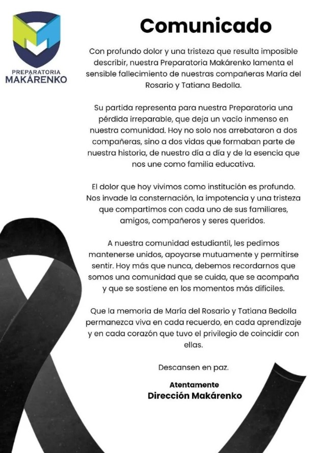 Tras los hechos en Michoacán, autoridades de la Preparatoria “Anton Makárenko” lamentaron el fallecimiento de las profesoras María del Rosario y Tatiana Bedolla, y llamaron a la comunidad estudiantil a mantenerse unida en este momento de duelo.