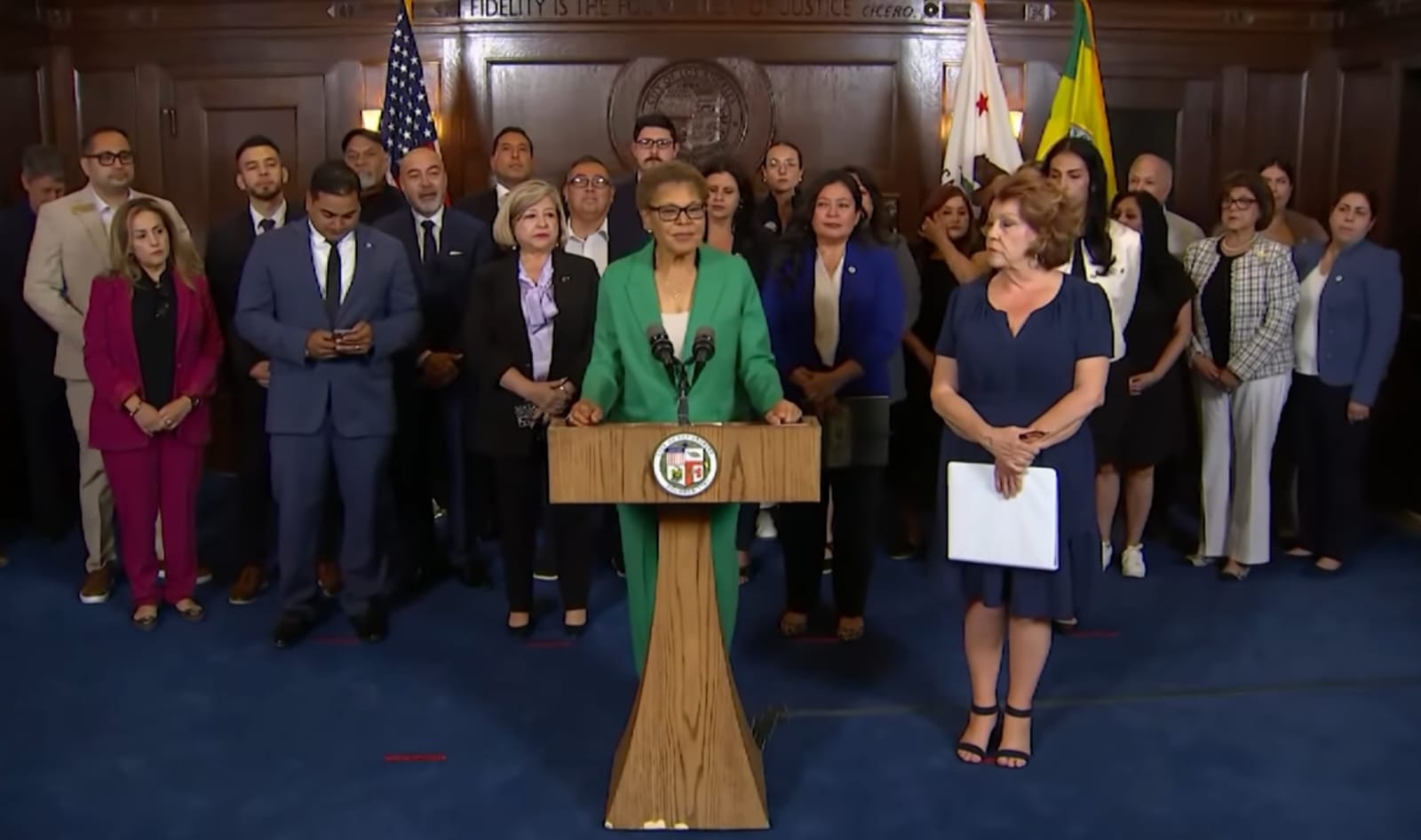 La alcaldesa de Los Ángeles, Karen Bass, así como líderes y representantes de más de 30 ciudades más pequeñas de California hablaron en una conferencia de prensa después de cinco días de protestas.